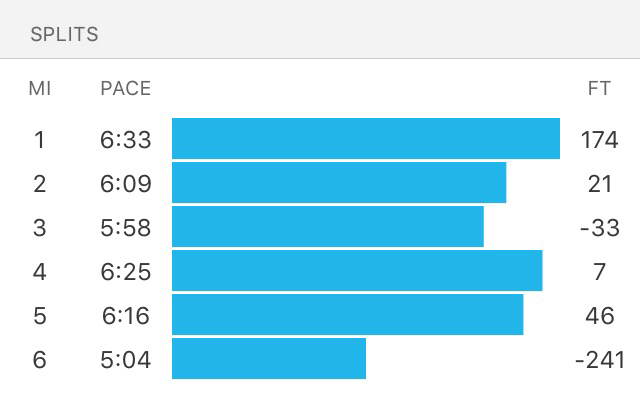 My splits from last year show how much of a struggle it was, especially in the 4/5 mile. It’s a rolling course with some sharp hills, which can take all momentum out of you.