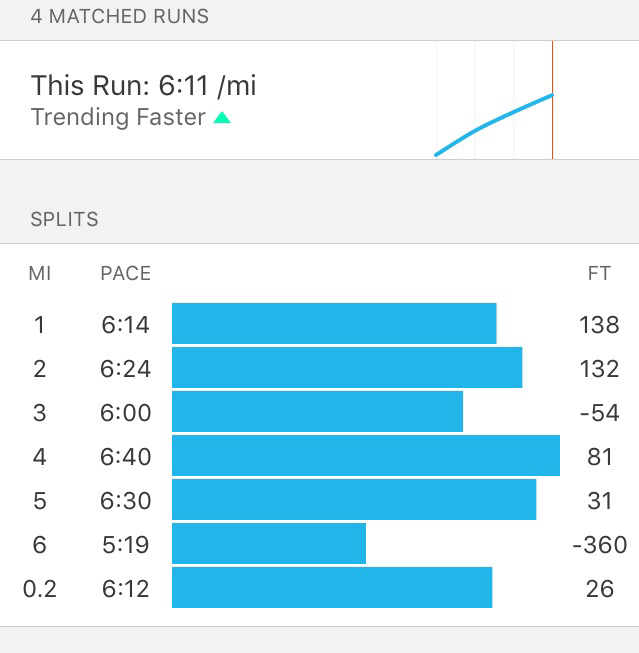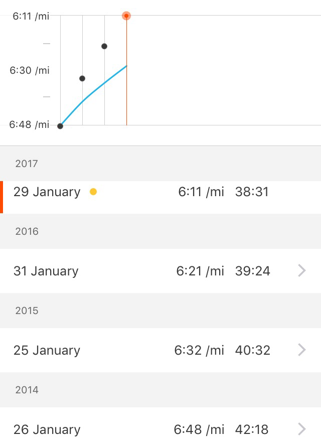 Something to take from this run, is I was quicker than last year. Clocking 39:24 last year. Heart rate was also extremely effortless averaging 136 and maxing out at 147. Splits, yearly progress and elevation also found below.