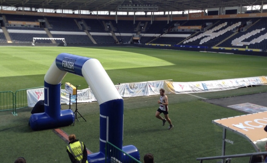 Now this is where it begins. I could see the end of the bridge and had found a little motivation to kick. Picking up from my 6:45’s or more to a measly 6:32, its something. Sweeping away from the other runners on the way out going underneath the bridge and rejoining them. Seeing a man dressed as a telephone box! Then onto the downhill that I previously faded on and the 3 best miles of the race for me. Not on paper but Mile 22/6:27, 23/6:27 and 24/6:27. As Jonathan has commented, I found my groooove! New for 2017 they’ve also put in a timed 100 metres on the Costello Athletics track, which I ran in 20 seconds. I wasn’t up for the 100 metre sprint and didn’t change my speed for it. I’m a distance man, not a speed freak. Passed again by a relay runner who had his own support bike, bit like Rocky Balboa, do it on your own man! But into the last 2 mile now. With manflu! Run around the stadium, I’ve seen these roads before. Entering onto pitchside to finish relatively strong.