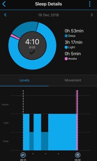 I hate treadmills. Got home, had some food, shower and bed. Managed to get comfortable and fell asleep for 11.15 not bad. Tossing and turning, woke up at 1. Glanced at the time on my watch, must’ve dropped back off. Tossing and turning, blocking the little red and green light from the tv using my quilt. Left the Xbox charger plugged in, so an alien light was in the room for the first time in forever! Woke up again around 3.30, glanced at my watch and laid there. Bright eyed and body being stubborn, not happening now. With 4 and half hours until I actually wanted to be up, my head was already up. It was laid there, bright. Ready. Rolled around, had a drink. Laid there. Now began the longest and most frustrating 4 and half hours of recent history. A sniffly nose started to develop, feeling tired and achey around 4.30. Then went for to the toilet for a pee, back to bed. Sore throat comes out of nowhere. Grabbed a Jakemans sweet from the side. Put that in for a bit. Ellie’s laid fast on. 5.30, I’m still here. Like an absolute champ, feeling like I could take on the world. But I’d rather not at the minute. 6.30, what’s the point in actually sleeping now? Glanced at my watch, started counting sheep. Does not work. Sore throat, blocked nose now, drier mouth. Probably a delayed onset from watching the super reds down at Oakwell yesterday in freezing temperatures. 7.15 the magic begins to happen, a yawn and by 7.30 I was in dreamland. My alarm goes off at 8. 4 and half hours later, dragged myself out of bed and clocked a massive amount of 4 hours 10 minutes sleep. So far from my ideal 8 hour. The Garmin technology on my wrist, had me as awake at 3:30 precisely.