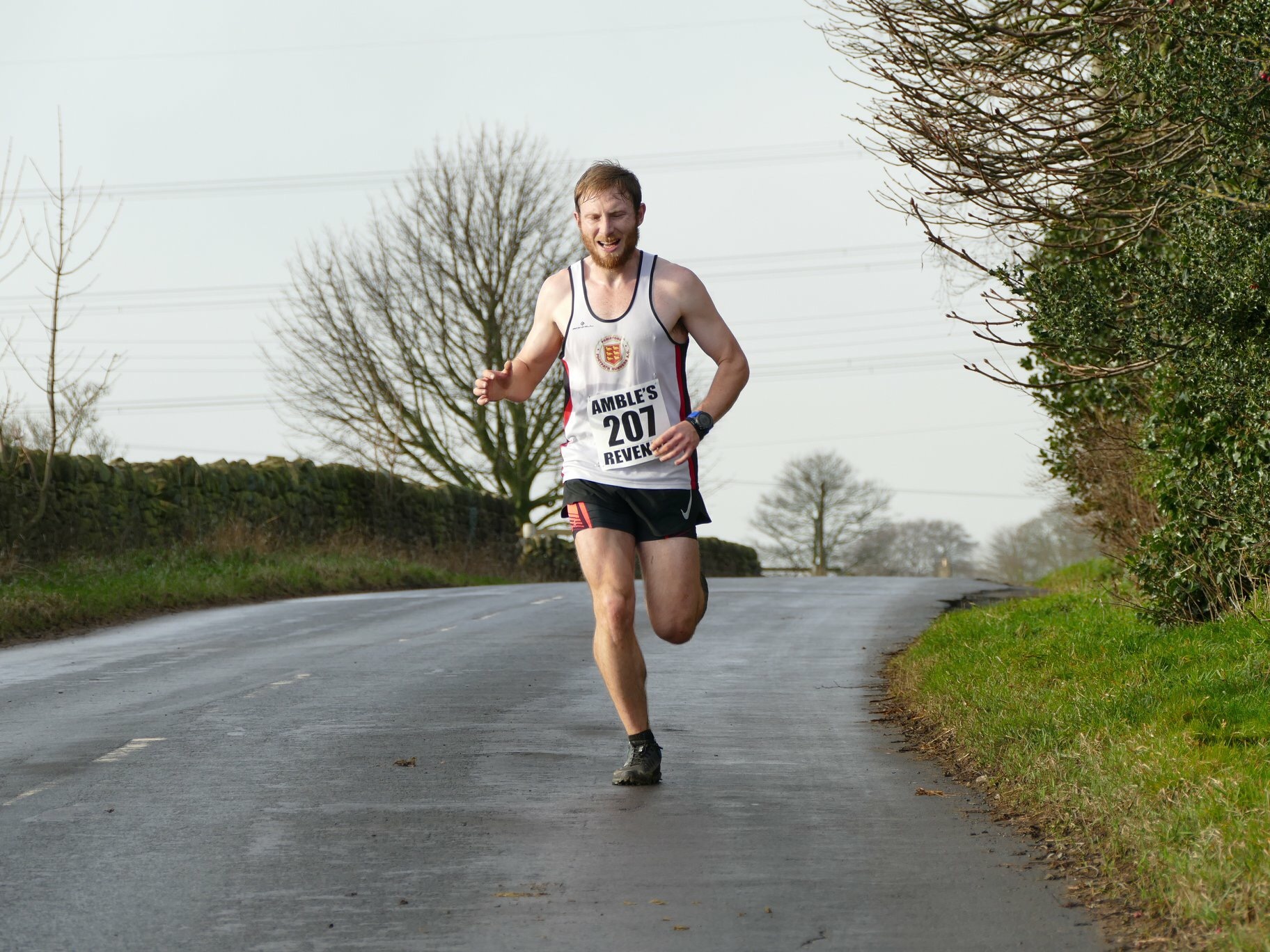 Flying down the trail with the wind at our backs, as always I set off quick and found myself out in front. Setting my early pace and getting that average up, it’ll come way down later! Like running down to the tunnel on a wednesday night. Oh, wait, we are! Then a slight detour left up and over, away from something familiar, to something known but of recent not really ventured. Up and over the tunnel, flying down hill again eventually. Last year, full of ice! So today felt extremely fast, enjoying it and feeling alright. Before hitting the bottom and now onto the road section of the famous Trunce. Ready for the first challenge and what that always hurts my back on the Trunce, the field ‘jump.’ Down the wall and into the field, didn’t hurt the back today! Through the narrow bridge and my race began to take a sharp change, a misplaced foot on exiting the bridge. Kicking my own calf and giving myself a dead calf. Mistake. Trying to climb with what felt like lead in my lower leg. Thankful for avoiding the awful quarry climb today. Getting up and out of the ditch.