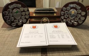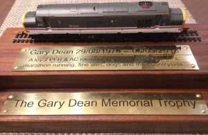 Chitchatting, the evening got underway. A round of applause for the two runners we’ve lost through the year. Norman Cole, who lost his battle a few weeks ago, and Gary. Up stepped Steve Dickinson to present the Chairman’s award, awarding it to Keith Gordon for his outstanding work and commitment towards Penistone and the wider running community. Then up stepped Caroline Dean, to present the Gary Dean award. She began talking as we all listening intently, whilst holding a newly crafted award, topped with a model train, a Class 37 diesel intercity locomotive. I’ve learnt that now. Inscribed with ‘A loyal PFR & AC member and a lover of Class 37’s, marathon running, fine ales, dogs and the countryside.’