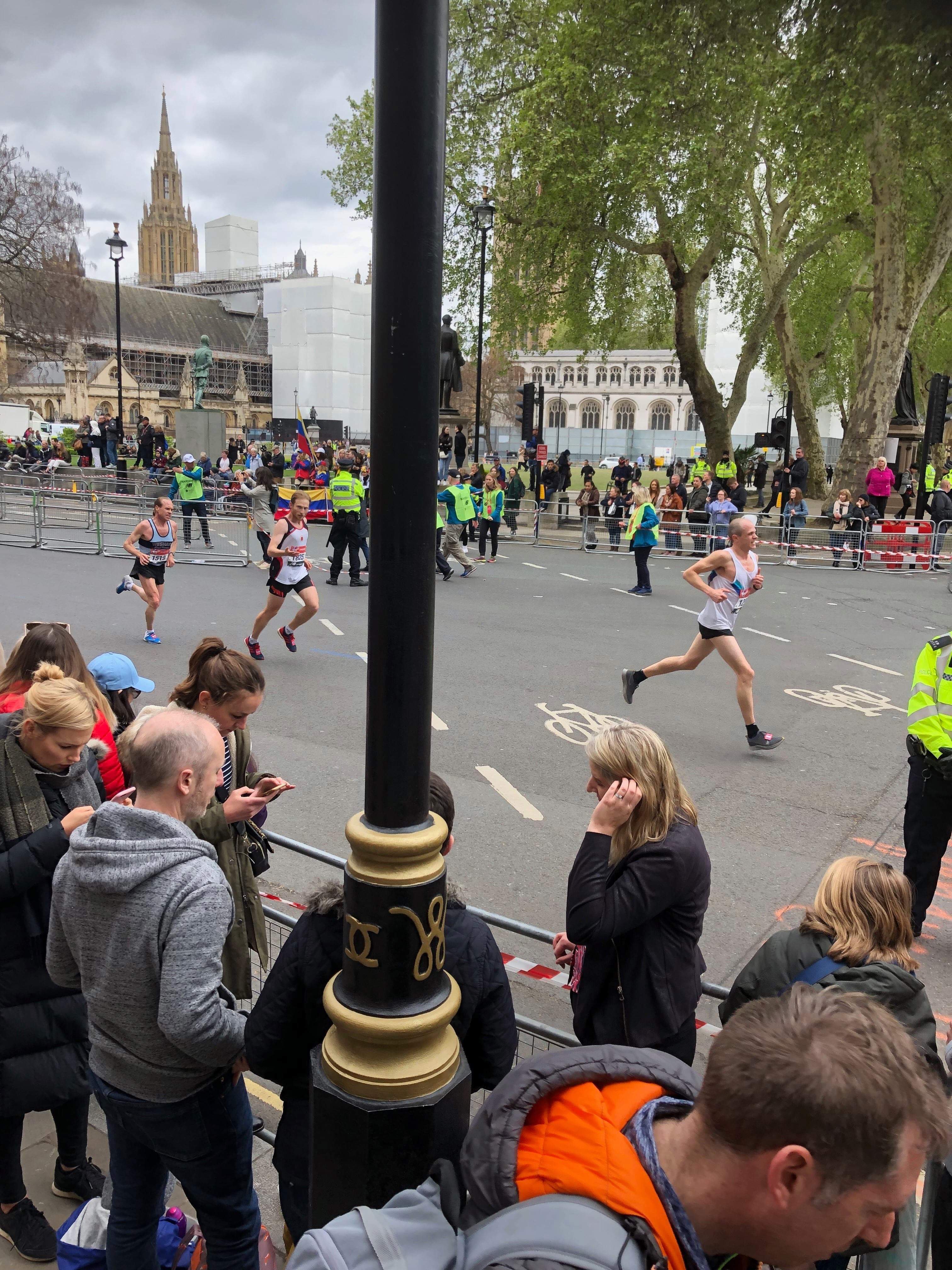 Martin took a quick photo before I made my way again to the toilet, just in case! Then dropped my bag on the lorry. Down to my t shirt and vest, evident now that the wind may put a dampener on peoples day. Clear that with it being a point to point course, a battle with a headwind may be about to take place. It was like a ‘who’s who’ of distance running. Looking around, spotting Adam Holland, Russell Bentley, Josh Sambrook, Scott Harrington, Jonathan Walton, Carl Ryde, Jason Cherriman. All runners who I have brushed shoulders with, all quality runners who have achieved loads, with plenty more to come. All those like minded people, who lace up, to run long distances. Happily! Bag on the lorry, walking slowly but surely to the line. Glancing onwards, seeing Mo Farah, Kipchoge, Hawkins, Griffiths all out in front. Getting ready for the Kipchoge Chase. Loosening the legs. Toeing the line, splitting out of the pen. Being in a world of my own, getting pushed to the front of the line by Carl Ryde, also known as Andres Iniesta! If I was to share a race with him, then I haven’t done bad. Andy Murray on the podium, then the race begun. We was off and on our journey around the capital. The temptation to kick on, faster had begun. The temptation to try and beat the ‘elites’ was there. But knowing full well, that each and everyone out there today, is elite. We’re all running a marathon and we’re all running London. Barnsley got its moment where they saw me, about 20 seconds into the race! Hopefully on the shoulder of Kipchoge, maybe?