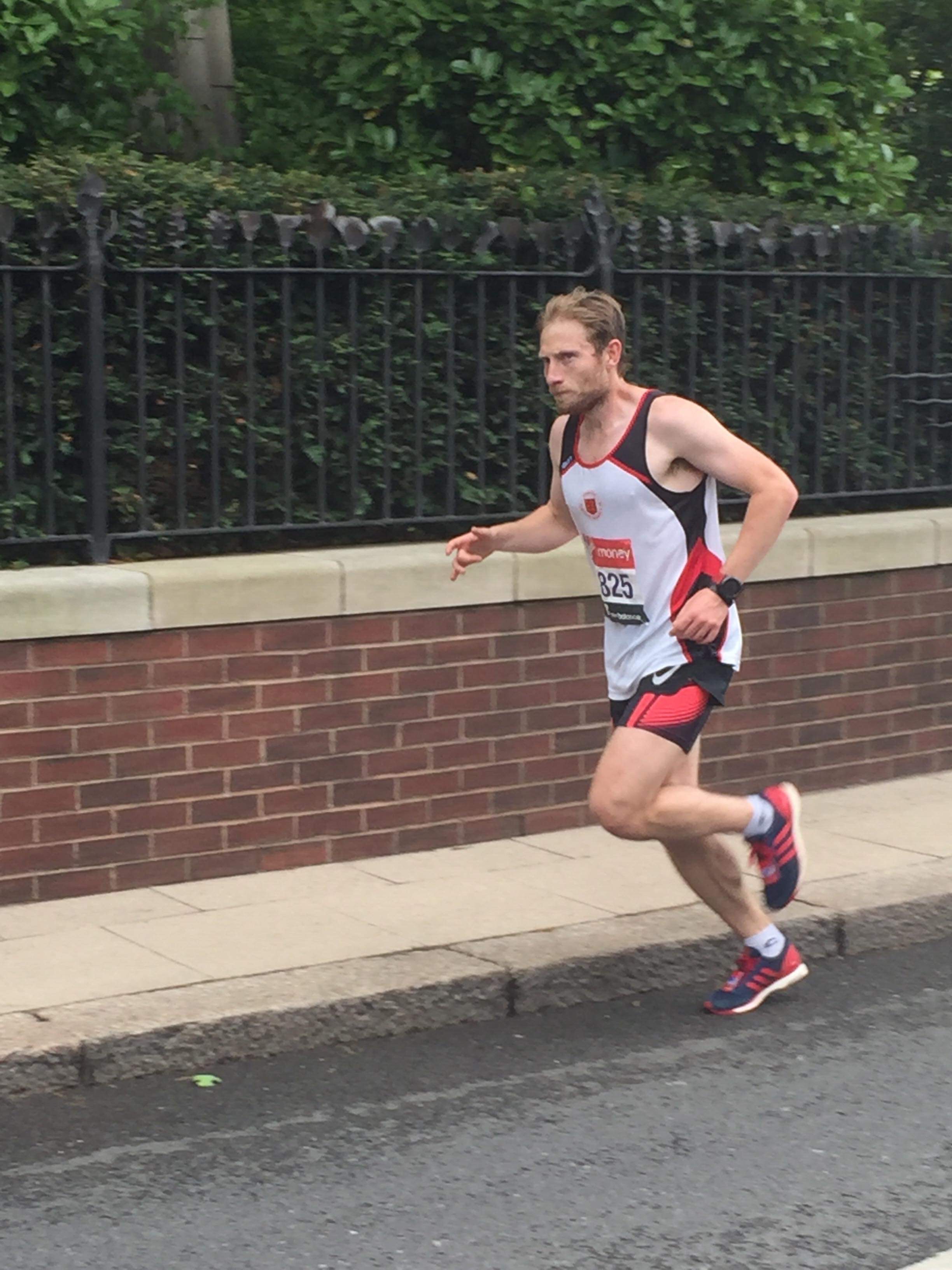 Camera managing to catch me as I’m at the front of the pack. Everything seems such a blur, a little surreal, as I’m experiencing an out of body experience. Am I really in control of what I’m doing, or how I’m running. The first learning point came for me, well second really. The first being, don’t spend a full day walking around the day before a marathon. Anyway, the second learning point. Penistone really does need an hyphen in it, to aid with the pronunciation. Peni-stone, not Penis-tone. A few runners around me, commenting on the Penis. Southerners, clearly. Feeling strong in the pack, dropping off the back, yo-yoing and going out in front. Pace quite constant and smooth, but evident again. The bloody wind. Now into an headwind, again. Holding this direction until around mile 10. For me, I was psychologically breaking it up to the point I’d see the Penistone Flag. Knowing that the Howsham’s were to be stood around mile 7, glancing ahead, holding my head high. Looking for them and for the flag. Looping around Cutty Sark, something I’ve seen many times on the tv. Knowing that it’s just a big ship? The noise clash was unbelievable, noise from every direction, hitting you, echoing off of the surroundings and hitting you again. Chasing through, didn’t have chance to take it all in. Then we was at mile 7, glanced ahead and saw the Howshams, just as we made a small climb over a bridge near Greenwich Quay. Seeing Jacqueline clear as day, waving and going bonkers. Before running on. Enjoying the moment and enjoying the London Marathon. The next iconic structure in the marathon for me was The Tower Bridge, probably the next iconic structure for medal. This again was another surreal moment, a moment and picture I’ve seen many times again on the tv. Seeing all the masses running across on their journey. Where the tv crews stop people for a quick chit chat. They don’t tell you about the small climb over the bridge though! Then the demoralising out and back section that comes afterwards! Seeing the elite women and visually impaired athletes on the other side, seeing the distance markers. Recognising to myself that I’ll be on the other side in roughly 10 miles time. Recognising that when I’m on that side, I’ll be running gradually uphill and into an headwind. GULP! Pace begun to drop off and the bravery of running 5:20’s began to show, the walking from they day before began to catch up with me, Manchester Marathon recovery legs began to take over. In hindsight, the wheels didn’t even fall off. They didn’t even go. Pace didn’t drop, not at all. I was running with a tailwind, so that probably helped! Although at this point, I knew from experience that at some stage the wheels were actually wobbling. I split the half way mat in 1:12:20. If only I could maintain that for the second half! I was confident in myself, that I would make it to the end but I’d let the group go on ahead. I was on my own and sitting with no wind protection for further in the race. I was tailing off. My head was all over the place. I kept it high, battling. I was dreading the return leg of the out and back section, truly and honestly dreading it. The first terrible bit came as we approached the Isle of Dogs, the tunnel. Not nice, but a moment of silence, away from the crowds. Where the hard work is put in. Likening it to Thurgoland Tunnel from the winter training, with a little bit less graffiti on the wall! We was away on the Isle of Dogs, looping around, twisting and turning. I don’t (for the first time in a while) remember any of it, all I remember was wishing it could be over. Wishing that I was past the Tower of London and 5k away from home and my legs would be ok. I was still upright, still running fine. Splitting around 5:30’s, marathon PB pace. So not too bad, I was ahead of PB pace in fact for the distance. Ahead enough so that it was achievable. Hoping that I’d enough in me to hold on. Then came the true terrible bit of the London marathon, the bit I was dreading, the turn back into the head wind, with the uphill drag (it felt like it anyway) back towards exactly where we had just come from. The bit doubling back, making everything else seem a little bit pointless. I was tired by now, I was aching. I was hoping for the finish. My pace had swayed from a steady 5:30 mile, to a generous 6:00. I was working for it, in a place on my own. Glancing ahead aiming to catch the next runner to motivate myself along. I knew the fade was coming, I knew two sub 2:30 marathons in a month was a massive ask. Although believing I am more than definitely capable, but chasing two PB’s over the distance was an even bigger ask. Questioning myself, questioning whether I’d gone off too fast and whether sustaining the 5:30 or 5:20 pace was a bad idea. Should I have gone off steadier? Should I have run more conservative? Answering myself, almost definitely not. The only way I can truly ever improve is by pushing and pushing; gambling my body to achieve things it may not be ready to achieve just yet. I was happy, I was in pain, but I was proud of what I had run so far. I just needed to make it to the end, in one piece! Back through the next tunnel at Mile 23. 5k from home, exactly where I wanted to be. Knowing the line, isn’t too far away now. Content and striving. The PB had slipped out of my hands, but the enjoyment and the experience was exactly where I wanted it to be. The 4:04 marathon runner from 2013, who entered a marathon to raise money for cancer research. Who entered Milton Keynes Marathon because it looked a good alternative to London, the 4:04 runner, who had no idea that the road running scene even existed; that people actually competed up and down the country every week, every day in fact, over distances other than a marathon. The 4:04 runner was in his element. Doing exactly what he has grown to love and enjoy, that is simply put; just running. Running and placing one foot in fron