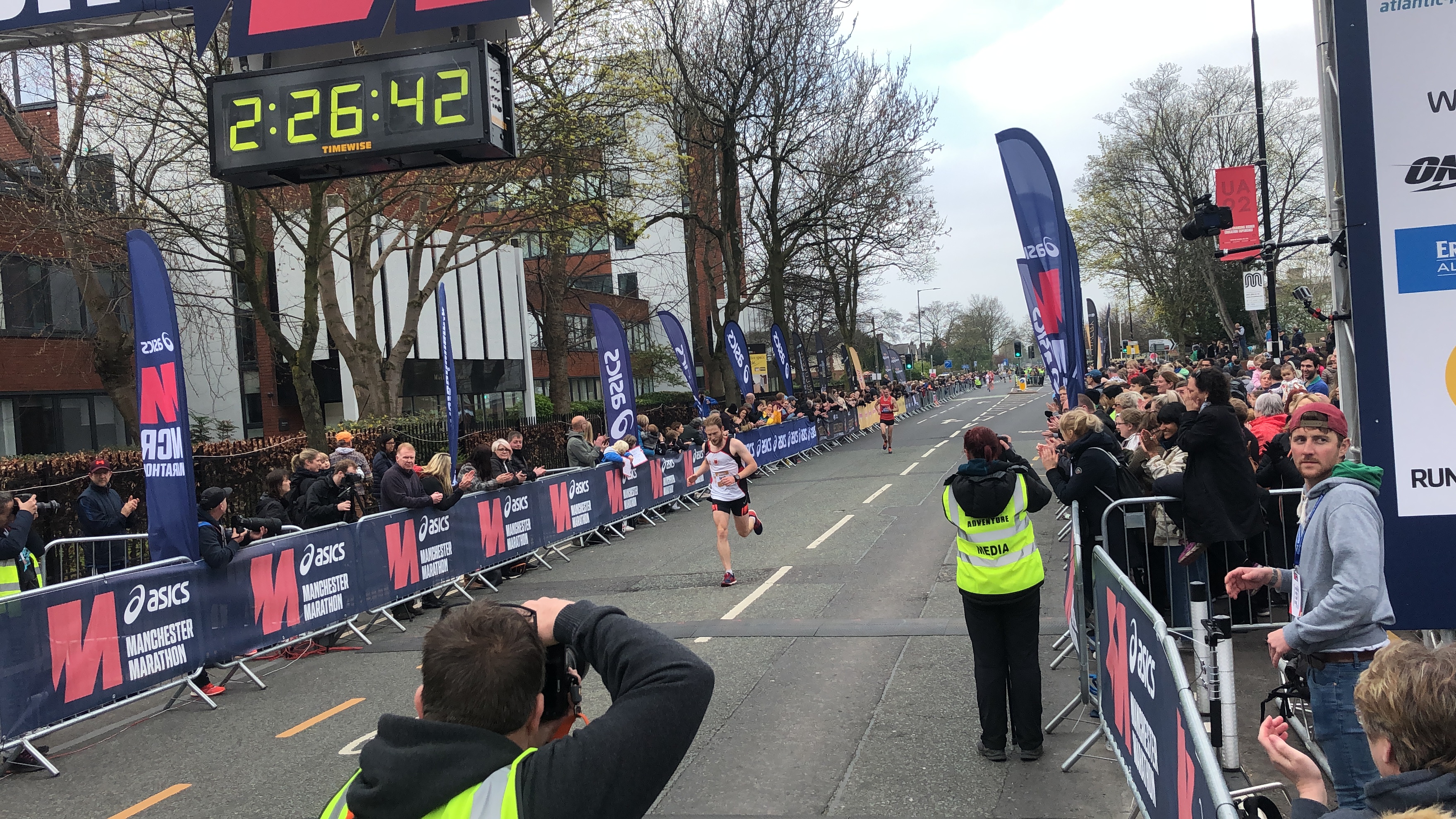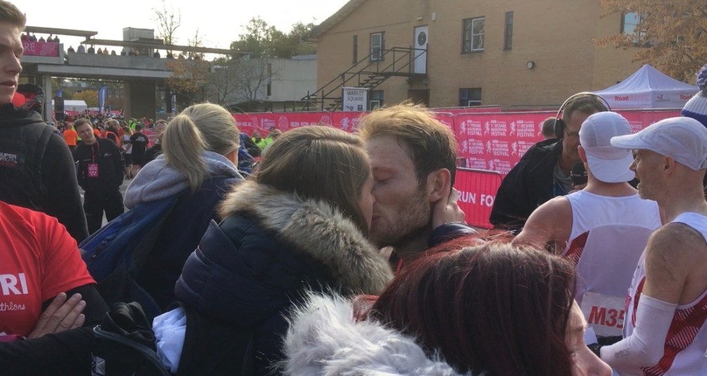 Lending itself to a fast start anyway, quickly got ourselves into a strong group of around 6 or 7 runners. Chatting about shoes, training, life and making it feel as easy as the first few miles should. Slowing my mind and making the miles feel good. Constant progress. A dig at Scott for his 2:25:04 at Berlin, something I’d eventually regret… he’d get it back on me, put it that way! Into the city, out the city before we know it. On the long country roads, headwind, every mile, a bloody headwind. Chasing, making the race as good as it can be. Running by all the spots that I’ve seen in previous years. Knowing the route, knowing the hills and the downs. The flats and the awful bits! 14-18-20… anticipating, being aware and prepared for them. Miles were ticking by, sticking in the pack. Drink stations were being ticked off, sharing, passing them along the line, doing our bit for the environment, aren’t we? Head up, looking ahead. The race wasn’t going to start until mile 20 anyway. The teller whether you’ve set off too fast, whether you’ve enough in the tank. Or whether you’ve done enough, whether it is your day or not. It began to go quieter and quieter, we began to settle down into our rhythm. The legs and training began to take over. Mile 8 came around and Scott made a break, I told him to go for it lad.. asking him if there was a Strava segment. He was a man on a mission! Dan went with him. I held back, it felt too fast. We’d been more or less comfortable until then. I conserved myself, reluctant to go with. Held the fragmented pack with Rob Weekes, Paul Martelletti, and a lad called Dave Hudson who I met in the toilet queue! Holding our pace and not drifting. I had my target in mind. I knew Rob’s as well. Him asking me early in the race. The mind was set. I knew my mini goals in order to get there. The 10k one had been ticked. Well 6 mile in less than 33:11. The 10 mile was approaching and was the right side of 55 minutes. Gunning forwards. Conserved. Next target for an even split, be 1:12:30 for the half. Giving me 2:25, dead, if possible! We were holding our small pack, and looking on ahead. Looking at the things fold out in front, but never, ever looking back. Charging. The half way marker came, just before we get to Stamford Bridge. The place I’d see Ellie, my Dad and Mum. Standing somewhere. Hopefully, if they’ve made it, in time. 1:11:40 on the road side clock. Didn’t check my watch. That was enough reinforcement, that I was doing it alright. Believe it or not, a half marathon PB. Win! But maybe I’d gone too fast. Driven and focussed, on my way. I wasn’t going to let that derail me.. eventually making our way down towards Stamford Bridge and onto the terrible bit, the long drags and two out and backs. The horrible bit… turning left, and blowing the wonderful Ellie a kiss. She even caught it on camera!