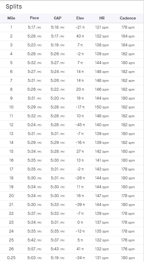 4th place, the same as last year. But more importantly a 1 minute and 46 second PB. Massive, over the moon and overjoyed. The fade happened from 24-26. But I was dodging and diving around the 10 mile runners in parts, so I kind of anticipated that. It is the slowest bit of the race in terms of profile on paper as well. But over the moon with the time regardless. That 4:04:22 runner just ran that. I know what to do for the next one, I know where I need to be, continuous progress and I’ll get there.