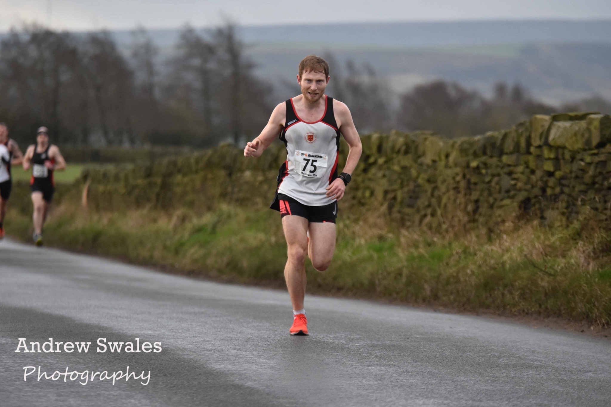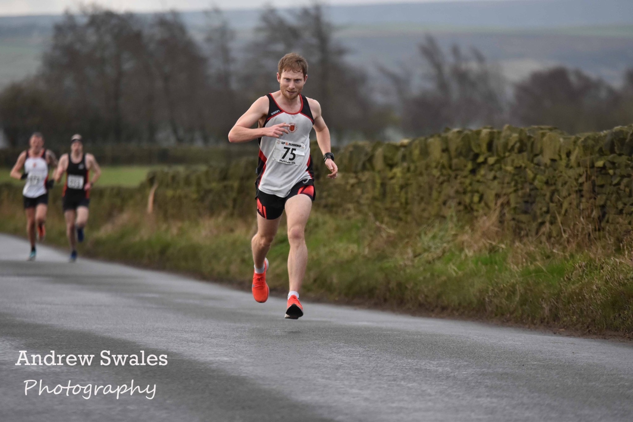 Head up shoulders back, looking ahead, hopefully it’ll stay that way! Hitting the top, top and making the left turn and then the headwind starts, around mile 2 into the race. Hoping for some sort of relief as we make our way down into the dip near Blackmoorfoot. Unsure completely whether I am ahead of myself from previous years or whether I am behind. Clocking each field we run by and glancing ahead into the distance. Unsure how close the guy behind is, the headwind absorbing all of the sound and all of the reference points in terms of people shouting and cheering or cars overtaking. Hitting Blackmoorfoot, which is roughly halfway, a marshal tells me the time I’ve run through in. 17 minutes ish, I was told. Not bad, now climbing out. Knowing that we have around 1.5 mile left of climbing to endure until the massive downhill. Relaxing and trying to predict whether it will be a tailwind or headwind on that downhill. Over the bridge at Holt Head which in previous years I’ve seen flooded up to my knees. Cars flying by, as I approach the top of the descent. Ready to open my stride and bounce down the hill, onwards and downwards. Go, go, go. Headwind, I’d predicted wrong during the race, but got it right as I was stood on the line talking to Clark, as Meltham appears in the distance. Striding down, if that is even possible, letting my legs go. Throwing my body into it, falling with style, Buzz Lightyear style. Hitting the small roundabout at the bottom, as my legs wobble and I begin the small but very large climb to the finish. Seeing the clock ticking in the 35 minute region, on for a course PB. Just as the rain begins to break from the cloud, crossing the line in: